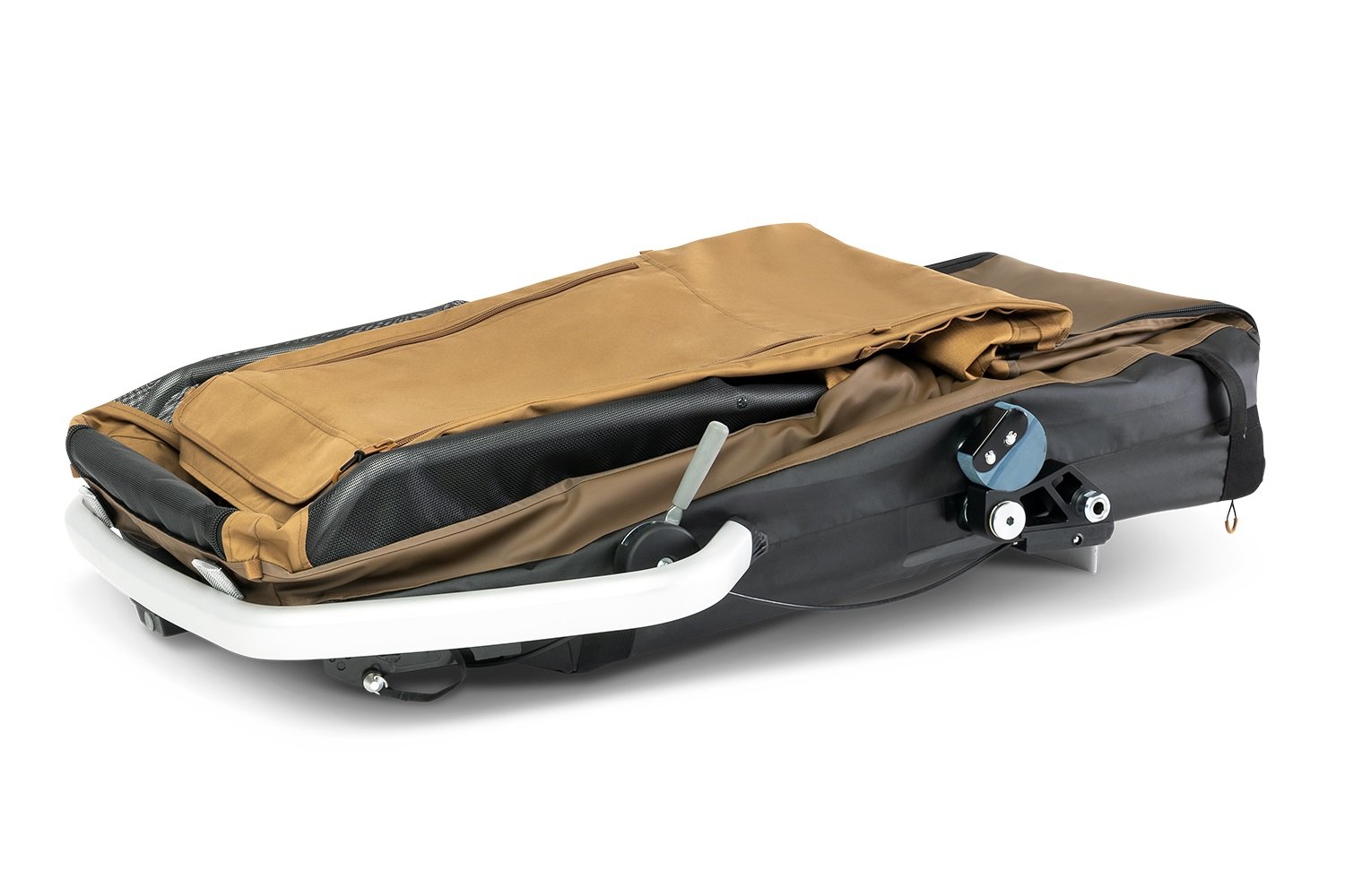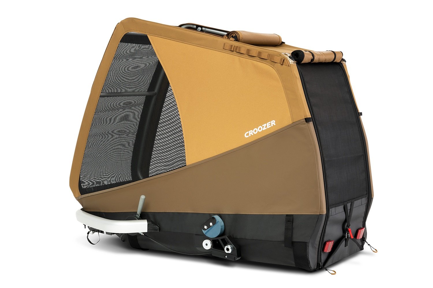 Grâce à couplage d’essieu de vélo Click & Crooz, vous pouvez connecter ou déconnecter la barre de remorquage du vélo d’un simple clic. La couplage d’essieu dispose également d’une serrure à clé pour protéger votre précieuse remorque de vélo contre le vol. La remorque de vélo pour chien Croozer Dog XXL Tammo peut être complètement pliée et les roues peuvent être retirées d’une simple pression sur le bouton du moyeu central. Cela crée un petit paquet facile à stocker. La remorque à vélo peut facilement être convertie en poussette pour chien si vous commandez le Croozer Dog Buggy Set en option.