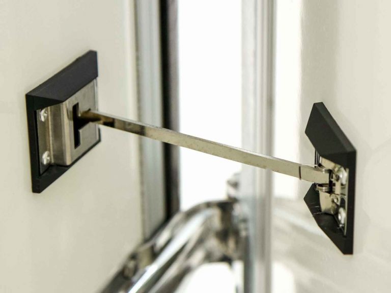 Serrure crémone sur porte à deux vantaux / verrouillable, en acier inoxydable.